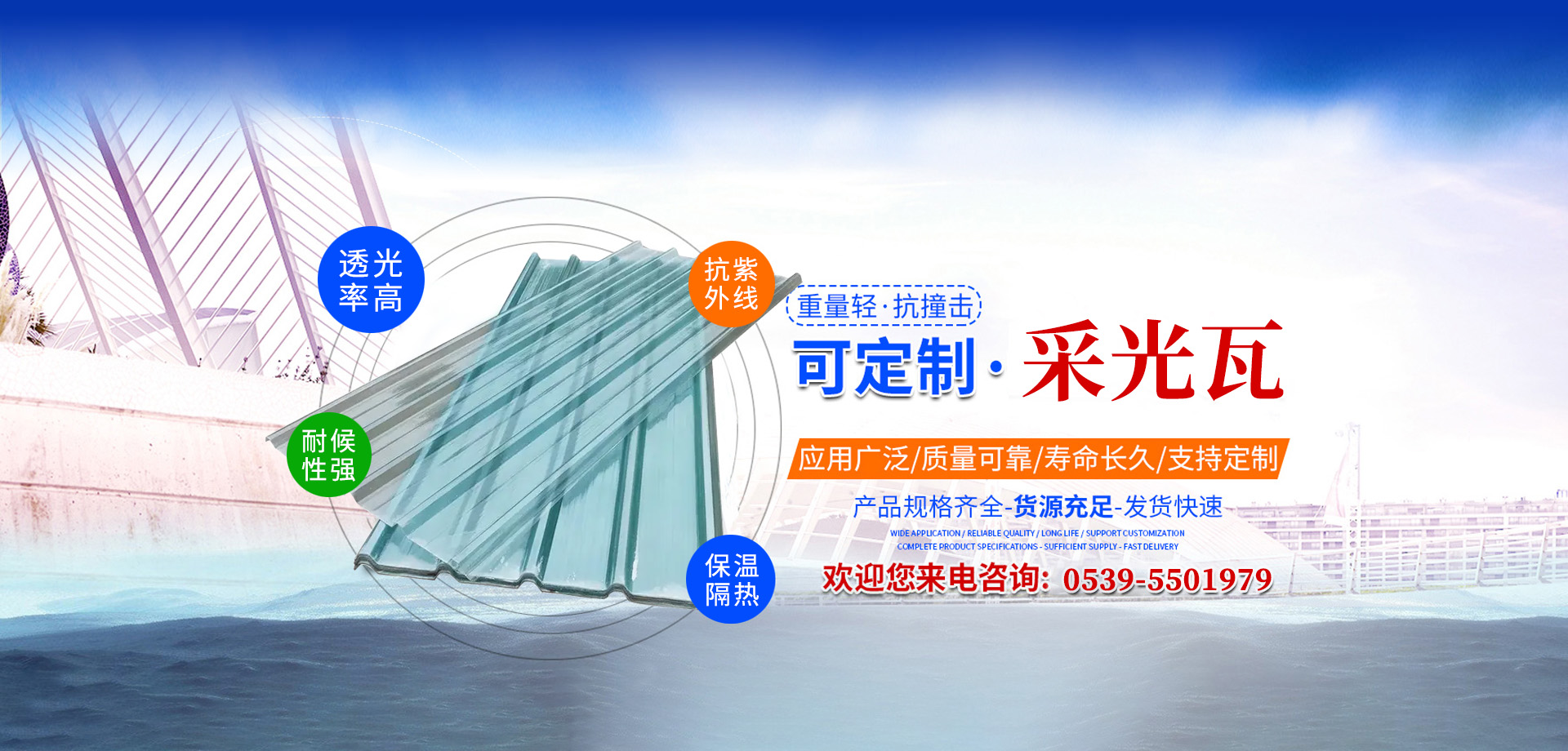 • 輕質(zhì)高強(qiáng)采光瓦便于搬運(yùn)、安裝,其抗沖擊強(qiáng)度可達(dá)玻璃的200倍以上